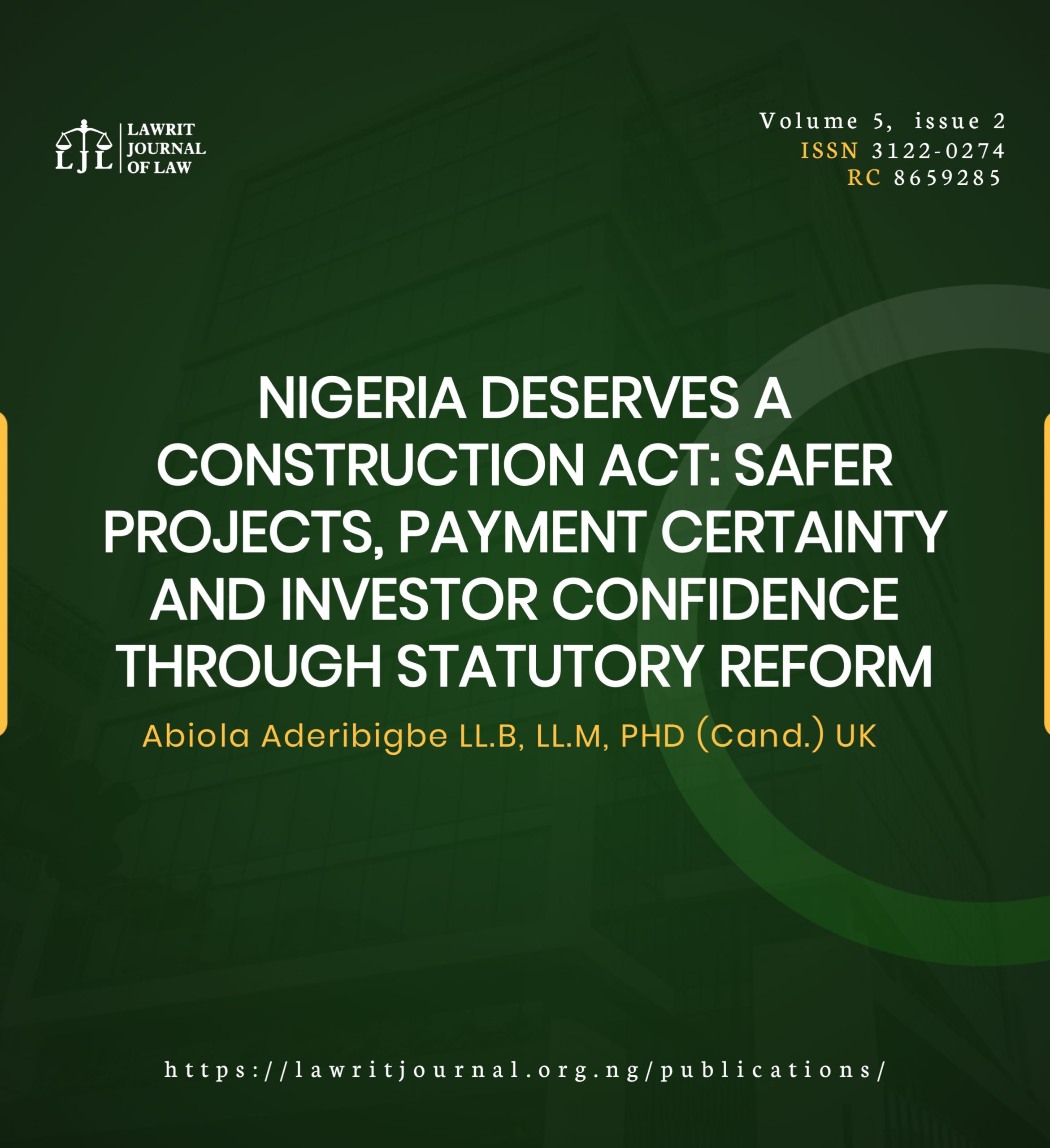 Nigeria’s construction industry is vital to growth and job creation but remains constrained byfragmented regulation, uneven enforcement, payment delays, and an alarming record of buildingcollapses. This paper argues for a Nigerian Construction Act that consolidates existing instrumentsand introduces targeted statutory interventions to improve safety, governance, payment certainty,and bankability. Drawing comparative lessons from the United Kingdom’s Housing Grants,Construction and Regeneration Act 1996 (as amended) and Security of Payment regimes inAustralia and Singapore, the paper proposes five co-equal, interdependent and mutuallyreinforcing legislative pillars: (a) contractor registration and grading; (b) health, safety &environmental standards, (c) governance and anti-corruption safeguards, (d) payment timelinesand statutory adjudication; and (e) skills transfer and local-content obligations. The analysis linksthese pillars to development finance norms used by multilateral development banks (MDBs) anddevelopment finance institutions (DFIs), showing how legal predictability lowers transaction costsand expands access to capital. The paper concludes with a pragmatic roadmap, stakeholderconsultation, legislative drafting, and federal-state coordination acknowledging constitutional andpolitical economy constraints. A Construction Act, tailored to Nigeria’s context, would alignincentives across clients, contractors, regulators, and financiers, reduce disputes and collapses, andstrengthen investor confidence in the built environment.