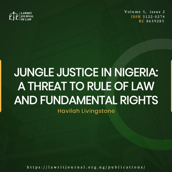 Jungle justice, also known as mob justice, refers to the extrajudicial punishment of individuals suspected of crimes, often through public lynching or killings without lawful trial. In Nigeria, this practice has become a persistent plague within the justice system, reflecting both the failure of law enforcement agencies and the erosion of public trust in formal legal institutions. It violates fundamental rights enshrined in the Constitution of the Federal Republic of Nigeria, 1999, including the rights to life, fair hearing, and the dignity of the human person. Jungle justice also poses a significant threat to the rule of law. This article examines the root causes and implications of jungle justice and argues that it directly undermines the rule of law and the protection of fundamental rights in Nigeria. It concludes with practical recommendations for institutional reform, enhanced public education, and strengthened mechanisms for upholding fundamental rights.